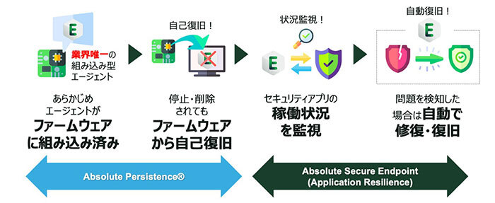 この仕組みの特徴について藤田氏は「ハードウェアレベルで動作するため、ソフトウェアが壊れたりOSが初期化されても必ず起き上がってくる」と語る。一般的なセキュリティエージェントは自身が停止すると自力では復旧できないが、Absolute のエージェントはファームウェアから起動されるAbsolute Persistenceのプロセスによって再生成されるため、一度インストールすれば以後はメンテナンスフリーで稼働し続ける。そのエージェントを使って他のセキュリティ製品を監視・修復することが可能だ。