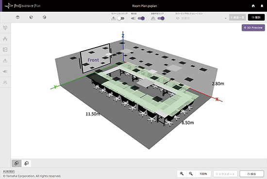 ソリューションとしての特徴で言えば、ルームプランニングソフトウェア「ProVisionaire Plan」が良い例でしょう。会議室など音響システムを導入する部屋の要件と什器のレイアウト情報を入力するだけで、わずか数分で適切なマイクやスピーカーの種類や数、配置などを自動で提案します。