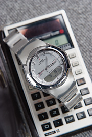My favorite最近購入した世界時間対応の腕時計と20年近く愛用する電卓。以前の腕時計は電卓同様20年近く使っていたが、壊れたので同じメーカー、同じブランドに買い替えた