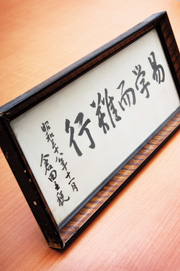 日立製作所に入社した際、課長研修で配られた格言を収めた額縁。同社創業者の小平浪平氏と苦楽を共にした倉田主税氏(当時の社長)から贈呈され、いまも大事に飾っている。「易学而難行」という言葉は、「学は易し、行うは難し」という意味で、吉川会長は「常に学ぶことを続けろ」という教えを、いまも心に刻む