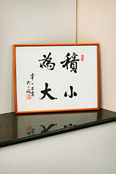 My favorite アマノの甲本恭彬会長から贈られた額。かの有名な二宮尊徳(金治郎)の言葉が書かれている。「大きなことをなすためには小さなことを積み上げる」という意味で会長の知り合いである、中国の書道家に書いてもらった