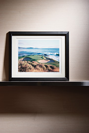 My favorite 米国のゴルフカントリークラブ「ペブルビーチ」の絵。難しいことで有名な7番ホールが描かれている。この難関でホール・イン・ワンの奇跡を演じた記念に、大切にしているのだそうだ。キャディにサンドウェッジで打つようにアドバイスも受けたという。「人生で初めて」だっただけに、満面に笑みを浮べる