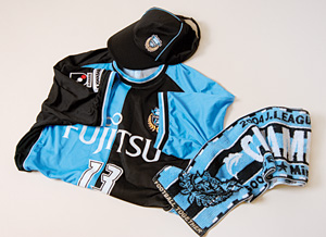 My favorite 富士通がスポンサーになっているJリーグ「川崎フロンターレ」のグッズ。観戦の際に使っているとか。マフラーやニット帽などひと通り揃っている。グッズが入ったビニール袋はくしゃくしゃ。使い込んでいる様子が滲み出ている