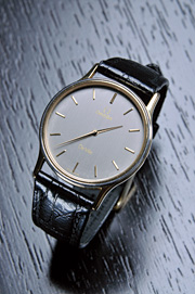 My favorite 結納のお返しでもらったオメガの腕時計。四半世紀にわたって愛用する。いくつか持つ時計のなかでも、身につける頻度が最も高い。「目立つ時計をはめる立場ではないから」、ビジネスではシンプルな時計を選ぶ。竜頭がなく、小さなボタンをボールペンの先端などで押して時刻を合わせるユニークな仕組みの時計だ