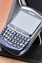 My favorite スマートフォン「BlackBerry」。メールチェックなどビジネスの場で活躍している。以前は別のモバイル機器を使っていたが、使いにくくて買い換えた。「本能的に操作できる」点が気に入っている