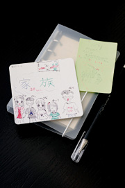 My favorite 子どもたちに贈られた手帳と絵入りのコースター。先の細いカラーペンで、家族の絵がかわいらしく描かれている