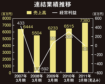 ワイズマンの2010年3月期の連結売上高は、前年度比4.5%増の65億円、経常利益は同452.6%増の3億円。11年3月期の連結売上高は同13.3%増の73億円、経常利益は戦略的な先行投資を行うためゼロ円の見込み。今期主要セグメントの売上高は、介護福祉向けシステム事業が同12.6%増の59億円、医療向けシステム事業が同20.3%増の8億9400億円の見通し。