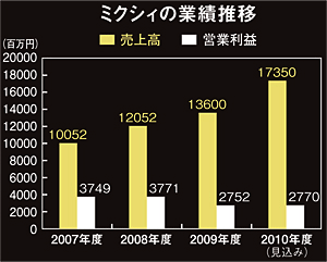 1999年6月、イー・マーキュリーを設立し、プレスリリースの配信代行サービスなどを手がけた後、04年2月にSNS「mixi」を開始した。06年2月、ミクシィに社名変更し、同年9月に東京証券取引所マザーズへ株式を上場。10年7月末時点での登録ユーザー数は2102万人で、7月の月間ページビューは297億7000万(PCとモバイルサイトの合計)。08年に中国に現地法人を設立したほか、10年9月10日には中国と韓国の有力SNS運営会社と戦略提携した。