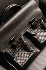 ・こだわりの鞄 イタリアの鞄「Bottega Veneta(ボッテガ・ヴェネタ)」は、「1泊程度の出張に役立つ」(林雅博社長)お気に入り。編み目柄が特徴で、「家内からは、ホコリがたまりやすいので、出かける数日前には言ってほしい(でないと掃除が間に合わない)と注文をつけられている」とか。