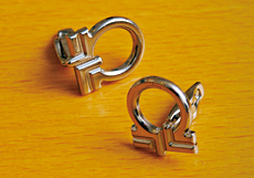 ・お気に入りのビジネスツール フェラガモのカフスボタン。昨年、山下徹社長にはこのコーナーでフェラガモのバッグを挙げてもらった。「ぴっちり口が閉じるカバン、ぱっちり止まるカフスが好き」ということで、このブランドに行き着く。カフスは山下社長の好みを知り尽くした奥様からのプレゼントだそうだ。