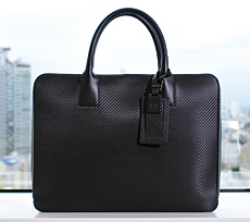 ・こだわりの鞄 「ダンヒル」のビジネスバッグ。「シンプルなデザインが気に入っている」とのことだが、実はこの鞄を買いに行ったお店が売り込み上手で、同時にDUNHILLのベルトも購入することになった。以前にDUNHILLの名刺入れも購入しており、「今では鞄、ベルト、名刺入れの三点セットで愛用している」そうだ。