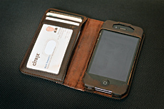 ・お気に入りのビジネスツール Twelve South社のiPhone用ケース「BookBook for iPhone」。小さな洋書のようなブック型で、クレジットカードや名刺なども収納できる。ユニークで機能性が高い点が気に入って、「実は、これは妻にプレゼントしたもの。1日で使うのをやめてしまったので、自分で使うことにした」のだとか。
