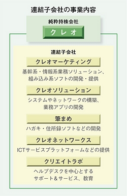 1974年、東海クリエイト設立。80年にパソコン用パッケージ分野に進出した。83年、日本語ワープロソフト「ユーカラ」シリーズを発売。90年、ハガキ・住所録ソフト「筆まめ」シリーズを市場に投入。現在、ハガキ・住所録ソフト市場でトップシェアを握る。04年、会計システム「CBMS ZeeM会計」を発売した。11年、持株会社となり、ガバナンス、株式関係に関する事業を除くすべての事業を、新設分割設立会社3社と吸収分割承継会社1社に移管承継し、既存子会社1社を含む5社のグループ新体制を発足させた。