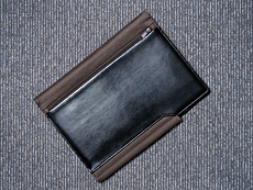 ・お気に入りのビジネスツール キングジムの合成皮革製ノートカバー「レザフェス ノートカバー」。ノートの差し込みポケットが設けてあって、レポート用紙やメモ帳も差し込むことができる。「それほど使い込んではいないが、メモ書きに使う。本革よりも合皮のほうが軽くて使いやすい」と話し、とくにこだわってはいないそうだ。