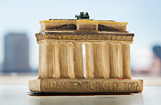 ・お気に入りのビジネスツール 東西ドイツ統一の象徴であるベルリン・ブランデンブルグ門の小型オブジェ。海外赴任先のドイツで手に入れ、「世の中が変わるシンボル」として、常に自分の机に置いている。「古いので、門の上の部分を飾る女神が折れているが、それでも絶対に捨てられない」というほど、お気に入りのものだそうだ。