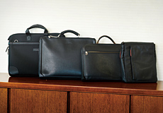 ・FAVORITE TOOL 鈴木社長のビジネスバッグコレクション。なかには、十数年前から利用しているものもある。普段用や短期出張用、長期出張用など、用途に合わせて使い分けている。一番右が普段愛用する肩掛けタイプのビジネスバッグ。「両手が空くので楽だし便利」なところが肩掛けのバッグを選ぶ理由らしい。