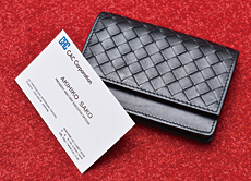 ・FAVORITE TOOL 編み目が特徴的な「Bottega Veneta(ボッテガ・ヴェネタ)」の名刺入れ。2011年、社長に就いたとき、大学の仲のいい同級生らがお金を出し合って贈ってくれた。「憧れのブランドだが、目が飛び出るほど高い。一人あたりの負担額を考えると申し訳ないが、でも、うれしくて、大切に使っている」と話す。