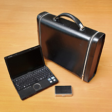 ・FAVORITE TOOL 鞄、ノートパソコン、名刺入れの3点セット。鞄は日本の老舗メーカーのもの。「開けにくいので、少し不便」と苦笑する。パソコンは、小型ながら堅牢性にすぐれたパナソニック製にこだわりをもつ。ちなみに、シルバーの名刺入れには、名刺ではなく、カフスや印鑑など、日ごろに使う小物を入れている。