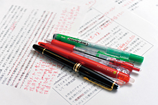 ・FAVORITE TOOL 「赤ペン」を愛用している。執務室や自宅書斎など「手に届くところに常に置いている」とのこと。部下から手渡された資料は、緑の蛍光ペンで要点をチェックし、赤ペンでゴリゴリとダメだしする。同社の広報部門にも「真っ赤になった発表資料が社長から戻ってくることもある」と、部員の一人は語る。