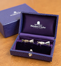 ‘過去、何度も失敗を繰り返してきた。当社も、もしかすると失敗するかもしれない。しかし、やらなければいつまでもできないし、いつかは海外の有力ベンダーに先を越されるだけだ’<“KEY PERSON”の愛用品>全英オープンの公式カフス NTTデータが公式スポンサーになっている全英オープンゴルフの公式カフス。優勝杯の「クラレットジャグ」にちなんだ水差しの形をしており「カフスとしては珍しい細長い形がいい」(岩本敏男社長)という。
