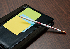 <“KEY PERSON”の愛用品>ビジネス文具三点セット スタンフォード大学の鉛筆。「革新性で定評のある大学。学生の気持ちになって現地でまとめ買いする」。そして、長年使っているノート。ポストイットは、ふと浮かんだアイデアなどを書き留めて、指示したり、ノートに貼ったり。