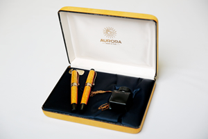 執行役員に昇進した2002年に、妻から贈られたイタリアの万年筆「アウロラ」。ふだんはボールペンでこと足りるという平岡社長だが、じっくり何かを考え、将来の構想を紙に書き記すときは「妻からもらった万年筆じゃなきゃダメだ」と話す。