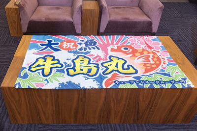 「牛島丸」の名前入りの大漁旗。キューアンドエーの仲間が開いてくれた送別会で、海釣りが好きな牛島社長に贈られたものだ。「皆がこんなすばらしい贈り物を用意してくれていたなんて知らなかった」と驚きとうれしさで胸が一杯になったと話す。