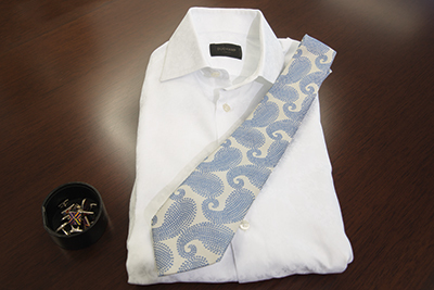 「白いシャツが好き」と、ふだん仕事で着用するワイシャツは、すべてが白だ。上着に合わせるようにカフスやネクタイも英国Duchamp(ドゥシャン)で揃えている。透かしが入ったワイシャツで、おしゃれ度を感じる。