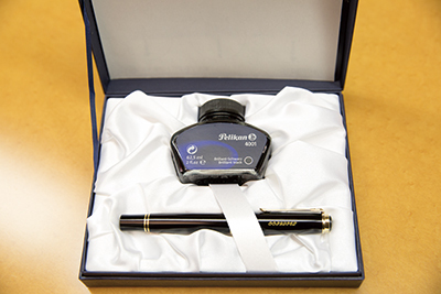 老舗ブランド「Pelikan(ペリカン)」の万年筆「4001」とボトルインク。2011年に当時の日本HPを退職する際、部下らからプレゼントされた。それから7年愛用。外資系のシネックスインフォテックの社長時には、契約のサインで多用したという。