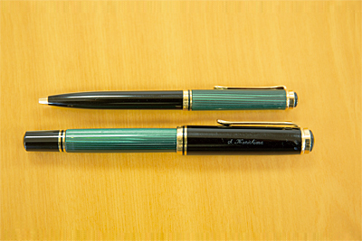 NTTデータの取締役に就任した2009年、奥様からお祝いにプレゼントされたペリカンの万年筆。「深緑の色合いが一目で気に入った。後日、お揃いのボールペンを自腹で買ったほど」と、肌身離さず大切に使っている。