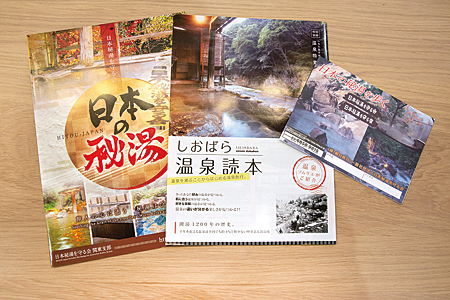 秘湯巡りのパンフレット。加水・加温せず、自噴したそのままの源泉を楽しむ。直近10年で「約200カ所の秘湯を巡った」。山の奥深くに分け入り、その土地の地酒をたしなみながら、夜は野湯から星空を見上げるのが「最高の贅沢」だと話す。