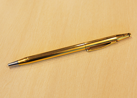 社会人になった30年前から、ずっと愛用しているクロスのボールペン。紛失したりして今は5代目。いつも同じデザインのものを買い続けている。「このペンを持っていると商談がうまくいくような気がする」と、験担ぎの意味もあるとか。