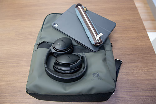 背負い式のビジネスバッグ「STARTTS」と携行品一式。バッグはある程度の雨にも耐えられる防水機能付き。「旅行鞄の上に乗せて海外にもよく出かける」。行動的な荻島社長に欠かせないツールとして愛用している。