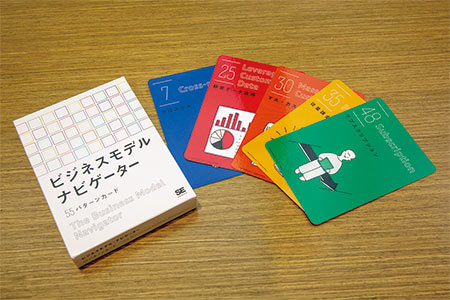 ビジネスモデルを55の型に集約して解説した書籍「ビジネスモデル・ナビゲーター」(翔泳社刊)の“カード版”。顧客のビジネスイノベーションをファシリテートする際に有効なツールで、鈴木社長も顧客の経営層とのディスカッションなどでよく活用するという。