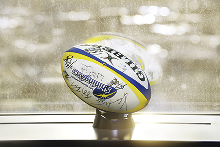 ラグビーチームの「NTTコミュニケーションズシャイニングアークス」のラグビーボール。NI+C社長に着任するまで熱心な応援団長を務めていたこともあり、選手らからサイン入りのボールを贈られ、今でも大切にしている。