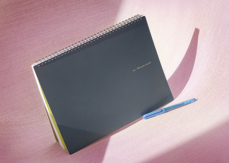 A4判のノートとパイロットのペン。仕事のアイデアなどを書き出して頭の中を整理している。同じノートを長年愛用しており、自宅には使用済みのノートが数十冊あるという。これまでにデジタル化にトライしたことはあるが、「紙に書く方がストレス発散になるし、発想が広がる気がする」と語る。
