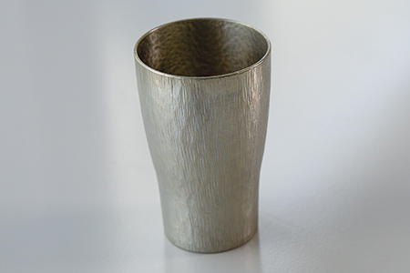 錫(すず)のコップ。「冷えたビールを注ぐとまるでクリームみたいな泡立ちになり、実際以上に冷たく感じる」と愛用している。奥様からの贈り物で、「あまり飲み過ぎないように」との思いが小さめのコップに込められているとか。