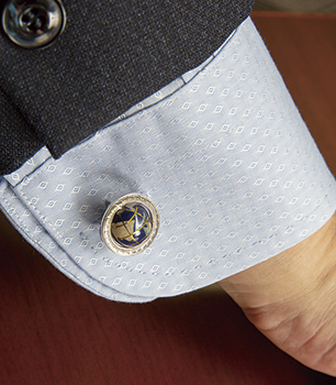 地球儀をモチーフにした英TATEOSSIAN(タテオシアン)ブランドのカフスボタン。新社名BIPROGYのもと、業際的なビジネスを誰からの制約も受けずに地球規模の発想で展開していく思いを込めて「地球儀のカフスをつけている」と話す。