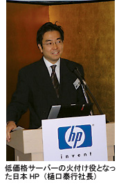 2003年年明け早々の1月8日、日本ヒューレット・パッカード(日本HP)がサーバー製品の大幅値下げを発表した。2002年は、旧コンパックコンピュータとの合併余波でビジネスが滞り、サーバー市場におけるシェア下落を余儀なくされたこともあって、IAサーバーで最大37%の大幅値下げを実施した。それ以来同社は、5回に及ぶ値下げを実施し、03年のサーバー市場の”台風の目“に。日本HPがサーバーシェア獲得に躍起になった背景として、デルの躍進を挙げることができる。デルは、HPが合併でビジネスが滞った02年にサーバーの売り上げを伸ばした。これら外資系2社のIAサーバーの低価格化によって、03年のサーバー市場は完全に価格競争に突入した。
