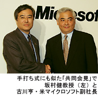 過去にOSの開発競争で熾烈な争い演じ”犬猿の仲“だったはずの2者が手打ち――。国産OS「TRON(トロン)」の開発者である坂村健・東京大学教授と米マイクロソフトの古川亨副社長が9月25日、東京都内のホテルで緊急会見を開いた。両氏の握手で始まった会見では、情報家電向けOSの「共同開発プロジェクト」を開始することで合意したとの内容と発表。いずれにせよ、マイクロソフトが歩み寄る形で”長年の怨念“は解消された。