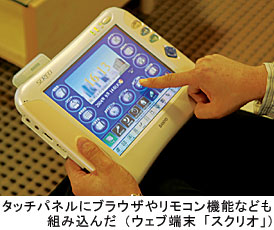 また、遠隔制御機能を利用することで、照明やエアコンのオン・オフも可能。もともと、スクリオ端末には、インターネットを通じてテレビ番組を確認し、テレビやビデオの操作ができるリモコン機能が内蔵されている。このため、オプションの照明・エアコン制御機能を加えると、ホームコントローラとしても十分に利用できるということだ。
