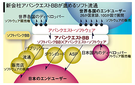 合弁会社、アバンクエストBBの資本金は1億円。ソフトバンクBBが49%、アバンクエストが51%出資した。10月中に設立し、準備作業を経て来年1月から営業を開始する。アバンクエストは欧米を中心に販売拠点を展開し、26か国言語のソフトを約100か国で提供している。同社は携帯電話やセキュリティ関連の自社開発ソフトやユーティリティソフトの販売権が数百あり、年間売上高は約100億円にのぼる。