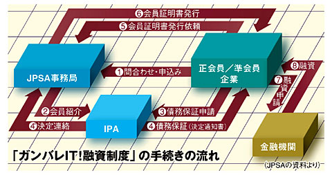 「ガンバレIT!融資制度」は、正会員、準会員からの申し込みをJPSAが受け付け、IPAに紹介。IPAは正会員、準会員から債務保証の申請をしてもらい、債務保証の可否を決める。債務保証の決定後、正会員、準会員はJPSAに会員であることの証明書を発行してもらい、その上で金融機関に融資を申請し、融資を実行してもらう仕組み。取り扱い金融機関は、東京都民銀行、横浜銀行、八千代銀行、朝日信用金庫、西武信用金庫で、2.0%前後の優遇金利で融資が受けられる。これにIPAの保証に対する手数料率0.75%を加えた2.75%前後が実質的な金利となる。