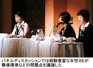 続いて行われたパネルディスカッションでは、SE経験のあるNECラーニングの内海房子社長と日本ユニシス・ラーニングの白井久美子社長が、仕事と家庭の両立方法や習得すべき技術力などについて議論した。内海社長は「汎用機の頃、仕事を任せてもらなかった。しかし、与えられた仕事は、どんな案件でもがんばり評価を得た」と、女性ITエンジニアが重要プロジェクトを任せてもらえない苦悩の時代を語った。