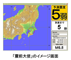 「震前大使」は、サーバー用ソフトと端末用ソフトで構成。受信サーバーが気象庁から配信される緊急地震速報を受け取ると、設定した配下の端末(パソコン)など最大128か所に対して、地震の到達時間や震度を計算し情報を再配信する。例えば、地点Xで発生した地震情報を解析し、地点Aは10秒後に震度5強、地点Bでは15秒後に震度5弱、地点Cでは25秒後に震度4というように設定地ごとの震度を計算し各端末に表示できる。
