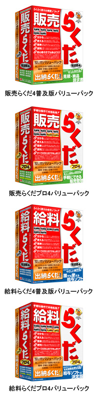 給与計算ソフト「給料らくだ4」、販売管理ソフト「販売らくだ4」ともに普及版とプロ版を用意しており、「給料らくだ4普及版」「販売らくだ4普及版」には出納帳作成ソフト「出納らくだ4普及版」をセット。プロ版の「給料らくだプロ4」「販売らくだプロ4」には、より高度な機能を備えた「出納らくだプロ4」をセットにした。価格は、「給料らくだ4普及版バリューパック」「販売らくだ4普及版バリューパック」が1万8900円、「給料らくだプロ4バリューパック」「販売らくだプロ4バリューパック」が2万5200円。