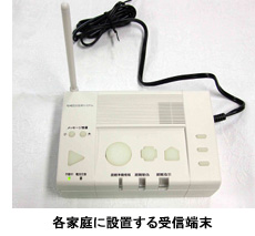 各戸に設置する受信端末を介し、自治体と住民をネットワークで結び、自治体からの避難指示や、住民からの安否確認などを実現するシステム。受信端末と中継装置をアンリツネットワークス、センター機能および関連するアプリケーションをNTTデータが担当し、自治体の協力の下での実証実験を経て、08年7月に商品化を予定している。
