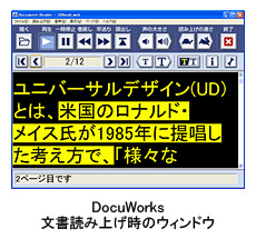 スキャナなどで読み込んだ紙文書やPCで作成した電子文書をドキュメント・ハンドリング・ソフト「DocuWorks」に取り込み、OCR(文字認識)処理でテキストファイルに変換した後に、音声で読み上げる。文書の内容を音声で聞けるため、視覚障害があっても情報をスピーディに共有できる。直感的に操作できるボタンを採用し、簡単に読み上げ音声の速度や音量を変更できる。ファンクションキーやショートカットキーによるキーボード操作も可能。PC画面に表示されるテキスト情報は、文字の大きさや背景色を変更できるため、弱視の人や高齢者も読みやすくできる。