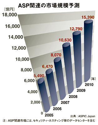 ASPの普及・促進活動を行うNPOのASPインダストリ・コンソーシアム・ジャパン(ASPIC Japan)の調査レポートによると、市場は年率約30%で伸び続け、2010年には1兆5000億円を超える規模になると予測している。セキュリティ技術の進化と回線の高速化に加え、「SaaS」が好材料になって、ここ数年で一気に広がった。顧客の関心は高く、08年以降も安定した成長が見込まれる。