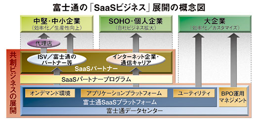 パートナー獲得施策に注力分野を移し、同プログラムへの参加企業を年内中に200社まで引き上げる。富士通とソリューションディーラー契約を結ぶ約750社のベンダーを中心に、参加を呼びかける方針だ。2月の発表から約3か月が経過し、パートナーの受け入れ体制が整ったと判断、SaaS型アプリケーションサービスの品揃え拡充と、売り手の確保に本格的に動き出す。富士通はSaaS型サービス事業で、2月に3つのメニューでサービス内容を体系立てた新プランを発表し、SaaS事業の本格化を宣言していた。この時点で同事業に賛同していた企業はオービックビジネスコンサルタント(OBC)やピー・シー・エー(PCA)、サイボウズなどISVを中心に11社いた。3つのメニューとは、(1)ISVなどがSaaS型サービスを提供するために必要な実行基盤(プラットフォーム)を提供する「SaaSプラットフォームサービス」(2)実行基盤を活用してアプリケーションサービスをユーザー企業に提供する「SaaSアプリケーションサービス」(3)SaaS型サービスを提供したいITベンダーや、ユーザー企業の詳細な要件に個別対応する「SaaSビジネスアウトソーシングサービス」がそれだ。